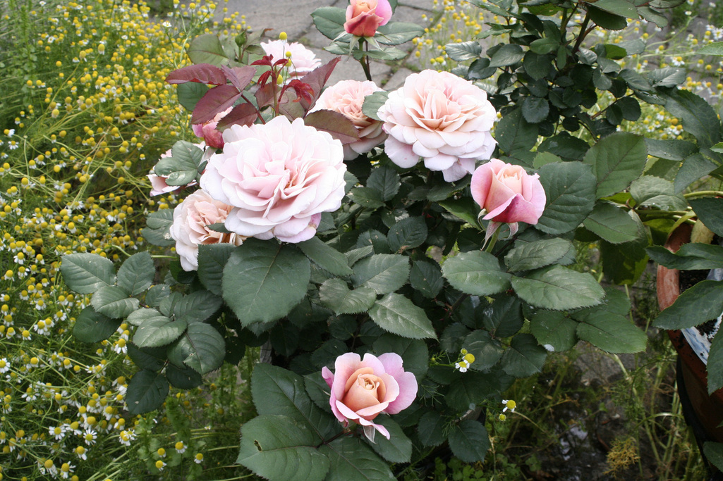 濃い赤からオレンジ色、ピンク、そしてシャンパンゴールドみたいな薄茶色まで、とても微妙な色合いが魅力的なバラです。