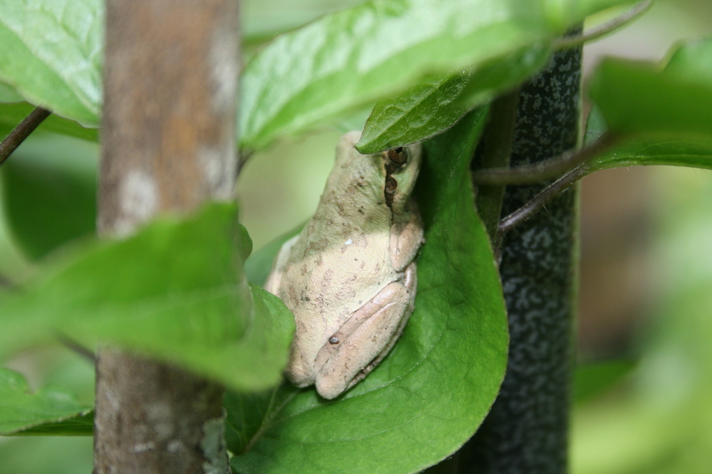 この葉っぱは・・クレマチス・・このかえるくん・・さっきまで隣の竹にくっついていたことが・・一目瞭然・・笑える・・まだ緑になってないもん(笑)・・頑張れかえるくん!!