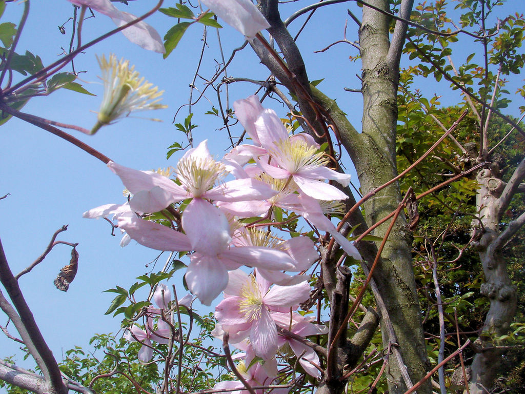 モンタナ系のエリザベス。開花2年目でまだまだ花数は少ないですが、甘い香りがそこはかとなく漂います。ピンクのハナミズキに絡ませました。