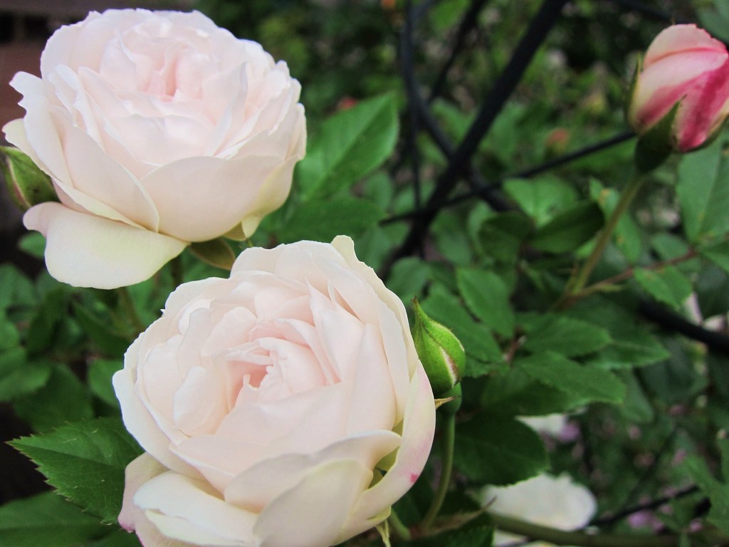 優しい色のツルバラですね。こんな色のツルバラがはかなげに咲くのっていい感じですね。