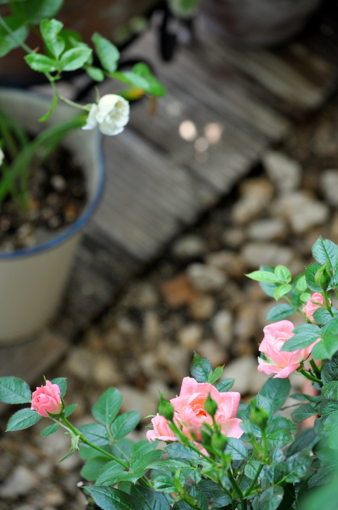 上品な可愛いバラ達ですね。下の小石や枕木?も良い雰囲気です。お庭全体を拝見したい!!