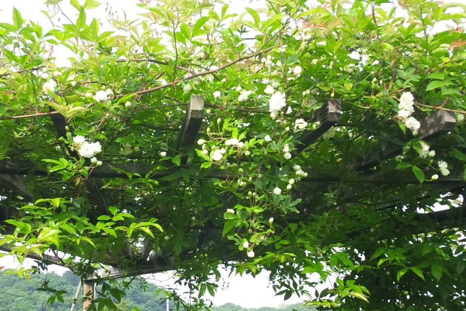 モッコウバラとポールズヒマラヤンムスクです。本当ならもうちょっと早く咲くはづだったモッコウバラでしたが、今頃満開。