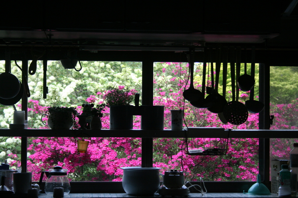 カントリーっぽいキッチンの窓を通して見る一面の綺麗なお花が、お料理を一段と引き立たせてくれることでしょう。この構図気に入ってます。心が豊かになります。
