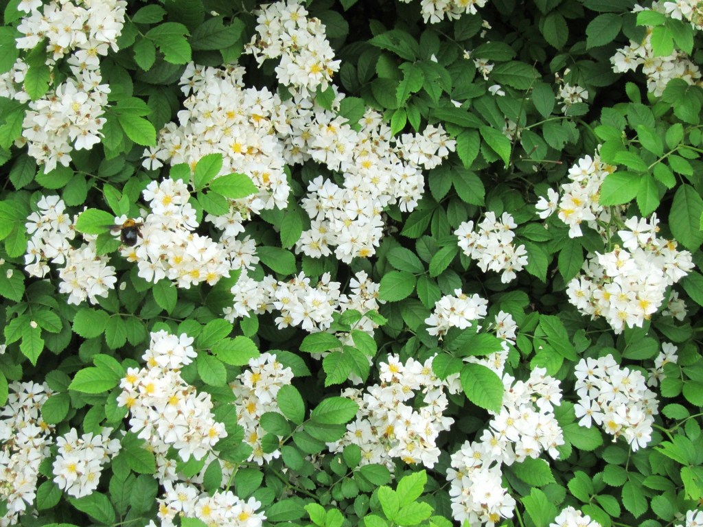原種の薔薇が石垣をびっしりと覆っていました。・・・香りにつられて蜂が・・・。