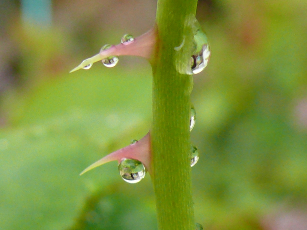 まだ若い枝の棘を雨上がりに撮影、痛そうなトンガリも、枝の若さで和らぎ、水滴が可愛らしさを加えてます。