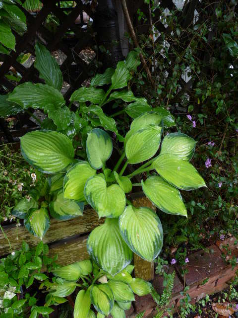 雨の日だーい好きですよ~、だって水やりお休みできるもーん。お風呂の残り湯を4リットル焼酎ボトル10本に汲んで、それでもまだまだ足りず、自分勝手な動きをするホースと格闘しつつ・・・どろんこびしょぬれ・・・だから雨の日はラッキー!それにギボウシの艶艶元気なこと・・・食べごろですよ~^^