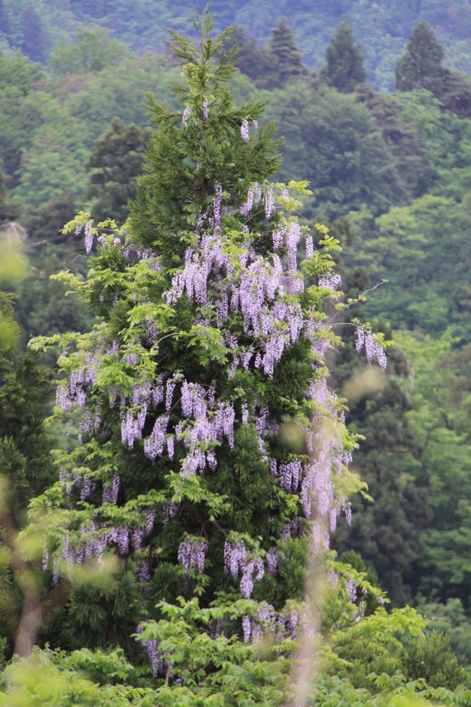 旅行先の山の中に藤の花が大きな木に巻き付いていました。