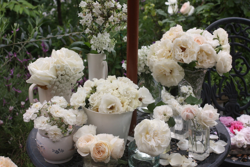 ものすごく贅沢!白バラだけでそんなにたくさんの種類があるんですか。どんどん咲いて大忙しですね。この時期は家中の花瓶を総動員してもまだ足りませんよね・・・それにもう飾る場所が~・・・うれしい悲鳴です。