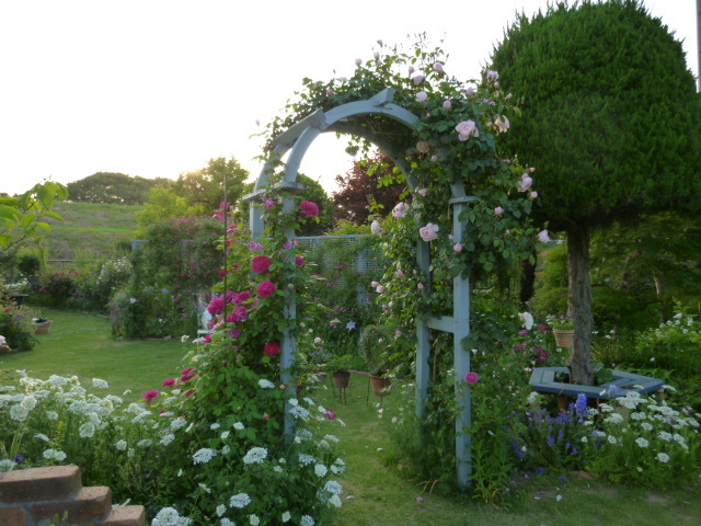 広々とした芝庭が気持ちよさそうですね。アーチやベンチのブルーがお庭に映えて素敵です。バラや下草もとてもきれいに咲いていますね。