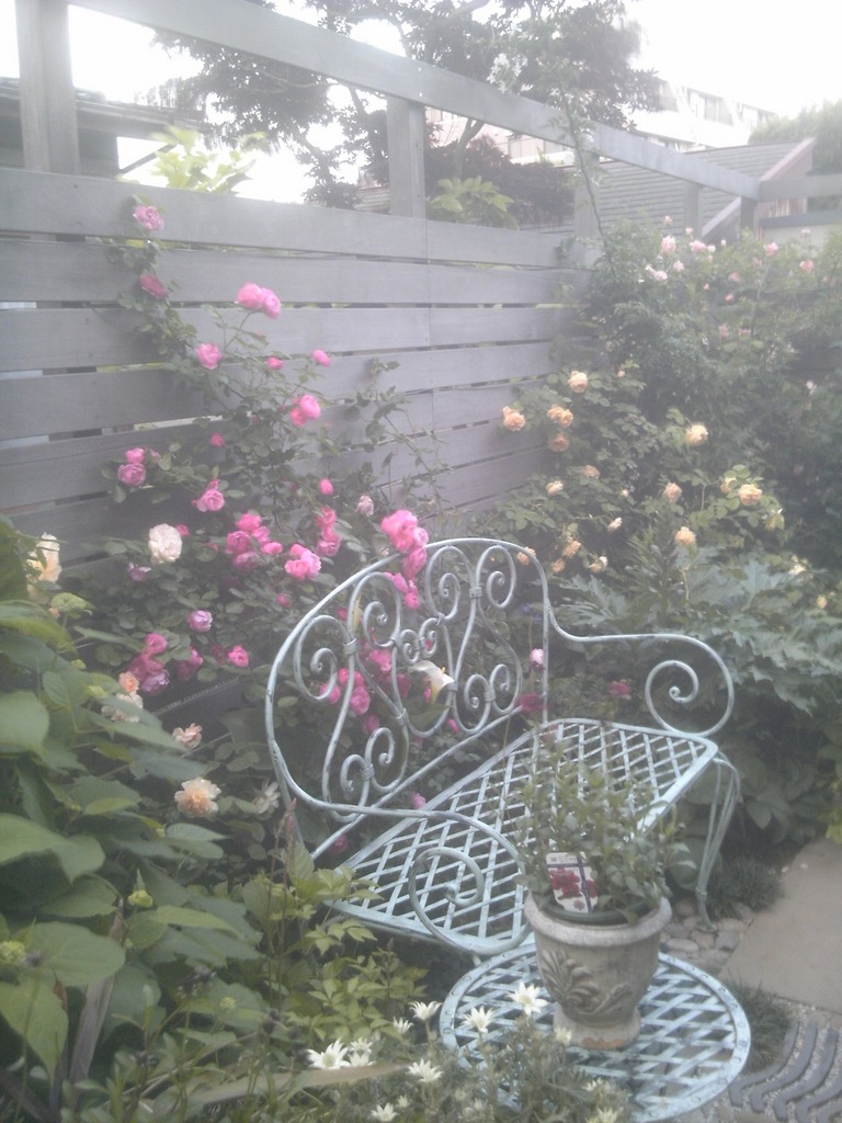 薔薇の色合いと、素敵なベンチがお似合いですね。