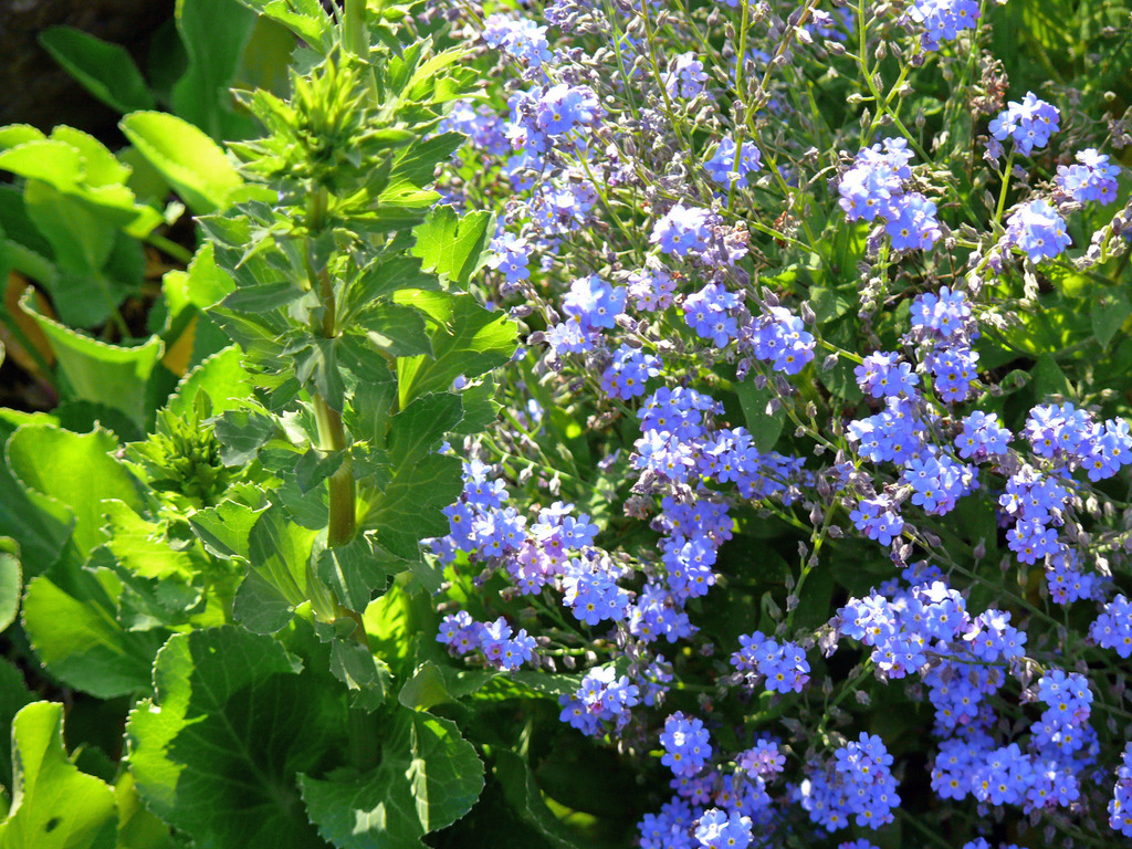 名わき役の勿忘草、バラより早く満開で、家を取り巻く様に咲き誇り、主役の座を奪います。