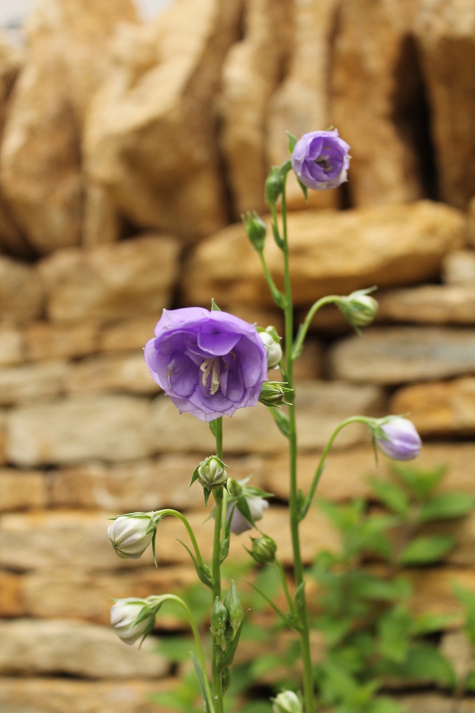 なんだろう?すっごく可愛い花ですね。八重のヒラヒラの花びら、風船みたいな蕾もいい。後ろの石の色がまたいい感じです。
