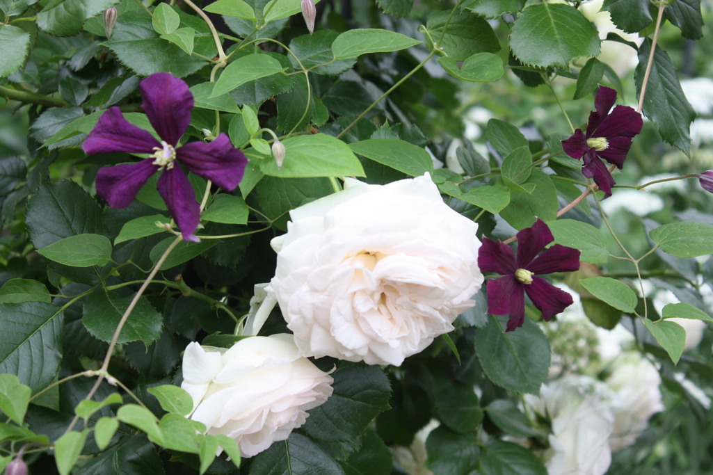 この組み合わせとてもいいですね。バラとクレマチスのコラボ憧れなんですよ~。なかなか開花が一緒にならず、花の向きも思い通りにならず難しいです。
