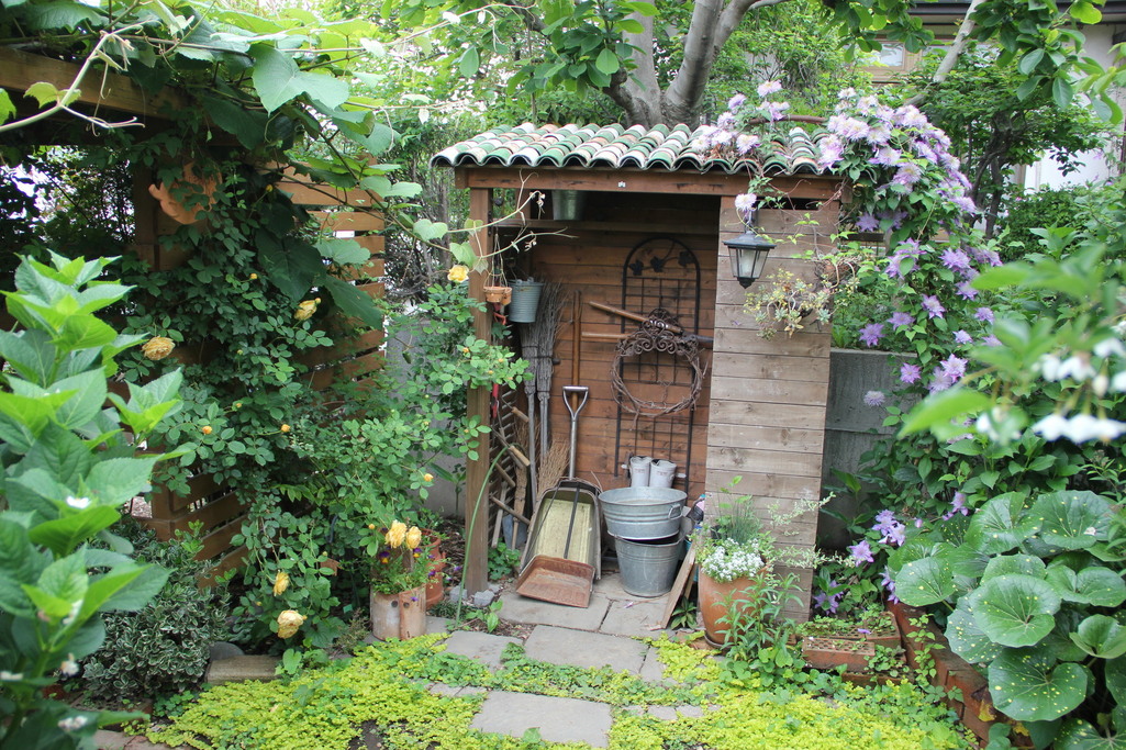 ナチュラル感がいいですね!バラもクレマチスも緑の中でさりげなく・・。斑入りツワブキ、欲しいです。雑貨類もいい味だしてますね。手作りできる人尊敬します(笑顔)