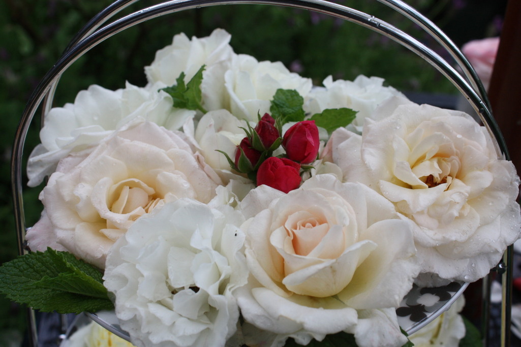 フレンチレースとサマースノーとアイスバーグ・・・雨で痛んだ白花をごまかすためにアイキャッチャーに使った赤いイチゴのようなものは何でしょう?