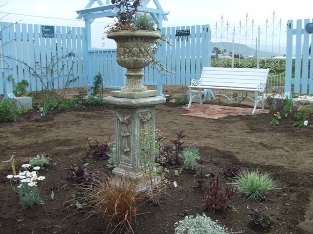 存在感のある良いカップですね。フォーカルポイントとして庭が引き立つわき役だと思います。
