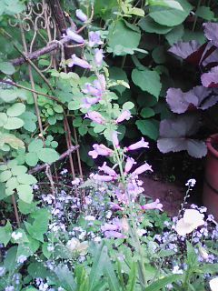 薔薇マルガリーテヒディングの横で、水色のペンステモンが咲いています。奥にはリグナリアがブラウンの葉を広げ始めました。