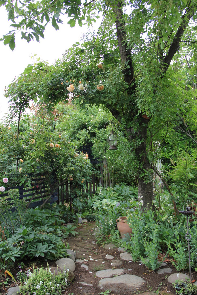 コナラの木に。。。パフビューティーを絡ませ薔薇のシャワーを潜りたいと思って誘引しました^^冬は、クリスマスローズ小道になります♪