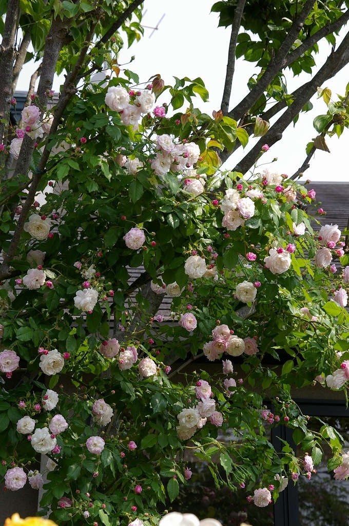 きれいですねぇ~♡こんな風に木に絡ませるのがツルバラにとって一番自然な姿なんでしょうね。憧れのスタイルです。やはりちゃんと誘引して留めているんですか?剪定とかは大変じゃないですか?