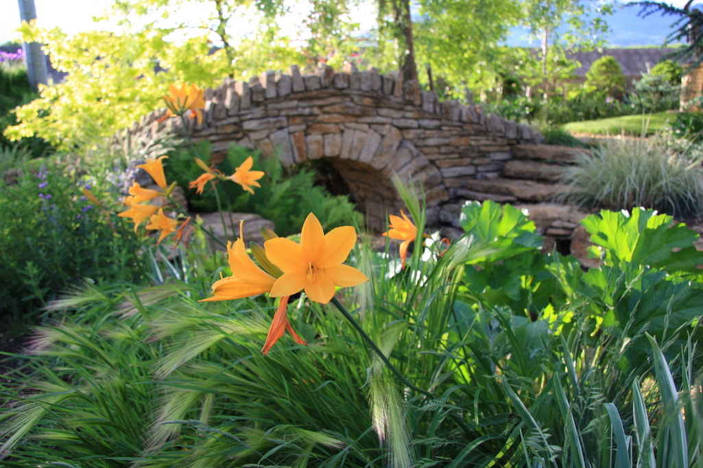 新緑にヘメロカリスのオレンジ、橋のブリックの色合わせがとても素晴らしいですね。バラもいいですが、こういう風景もとてもいいですね。ヘメロカリスと橋のお写真の中ではこれが一番好きです^^
