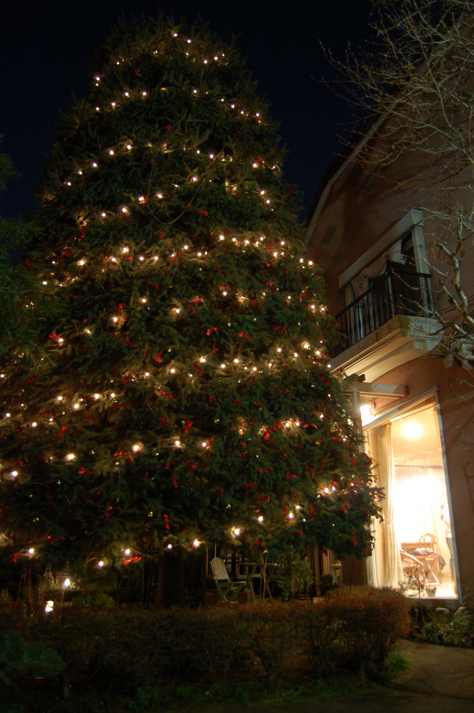 庭のモミの木にイルミネーションをつけて