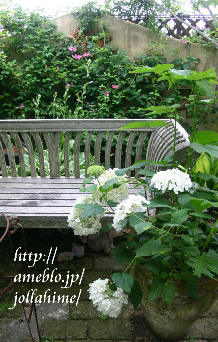 以前に登場した翼の折れた天使ちゃんはこのベンチの下で泣いていたんですネ。下に垂れたアジサイが「泣かないで」って覗きこんで話しかけてるみたいです。