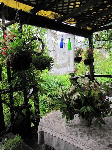 いいですねぇ~、ドサッと活けた花や、テーブルや窓に掛けたクロス、色の付いたガラス瓶、・・・どれもとても絵になりますね。周りがたっぷりの緑に囲まれているところがまたいいんでしょうね。