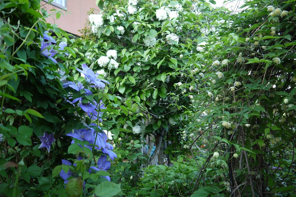 白花ハンショウズルはかなり旺盛です。このアーチを飛び越えて、その隣も過ぎて、垣根まで行っています。毎年かなり剪定しています。できれば木々に絡ませず、単独の何かがあると良いと思いかもしれませんね~ でも、とっても可愛いですよね!(*^_^*)