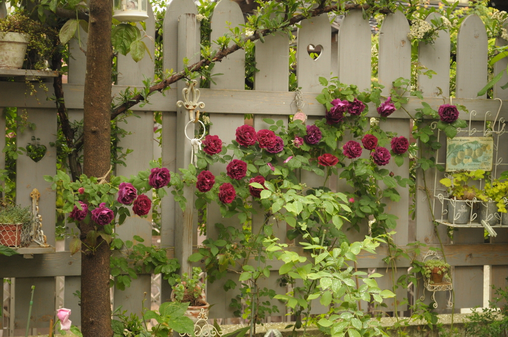 フェンスの白に映える赤バラの量がバランス良く、どちらも惹き立ててますね。