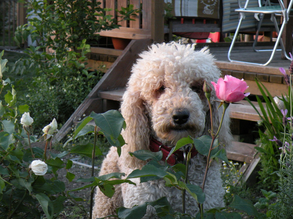バラと愛犬の間隔が絶妙で良い写真だと思います。まるでバラの香りで瞑想しているようにも見えます。