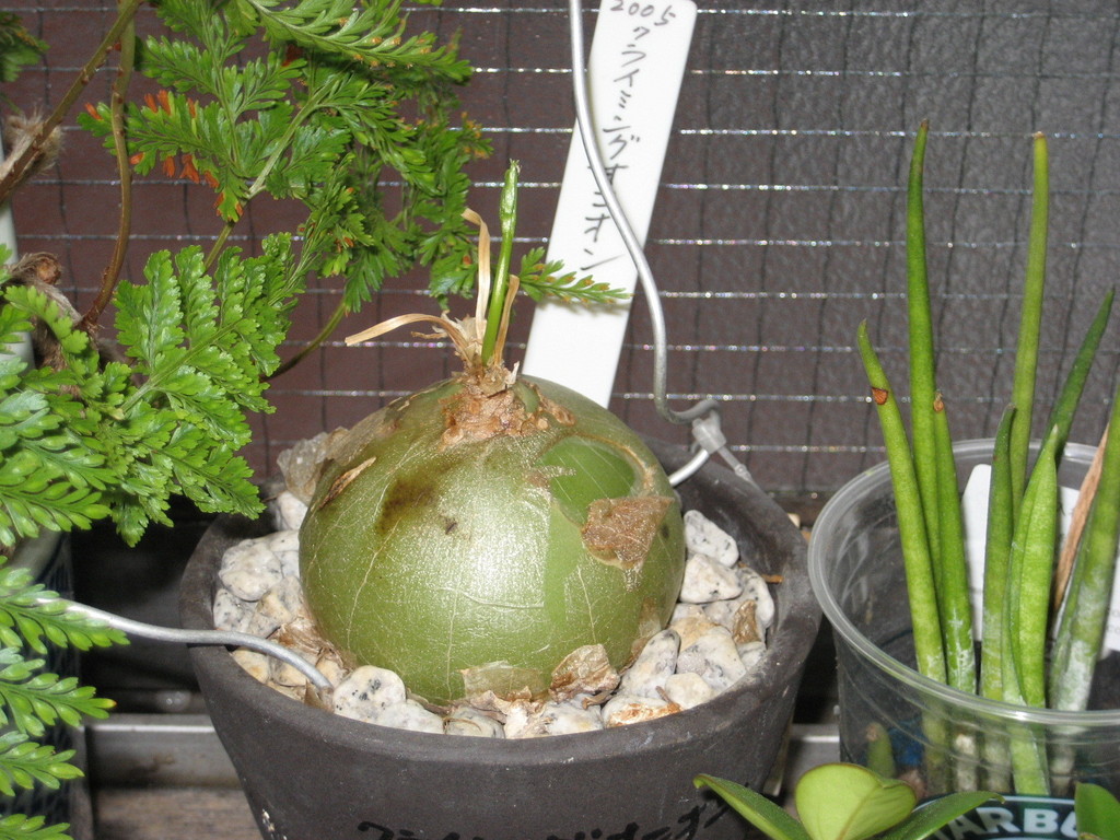 オニオンなんて玉葱ですよね台所の窓辺に2005年から暮らしています私は変わったもの好き・・・・・今年は寒かったから10日ほどまえに顔をのぞかせましたアスパラの葉の様なもじゃもじゃのつるが 12月頃まで見られます若緑が素敵な子です。